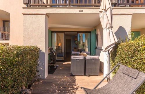 Shared secure parking is available on the property. Events are not permitted. The apartment sits in a hillside residence built in Provençal architecture, positioned between the Maures mountains and Mediterranean Sea, just 500 meters walk from the sandy beach and near Port Grimaud.