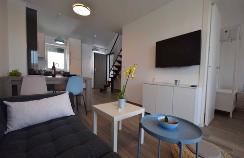 Modern Apartment Medna A6 is located on the second floor of an apartment house in the quiet town of Čižići on the island of Krk. This holiday apartment house is a semi-detached building with a total of 6 apartments, located next to the bike path and the promenade, creating an ideal environment for relaxing and exploring the beauty of the island. Soline Beach, known for its healing mud, is about 800 meters away, and for lovers of natural wonders, the Biserujka cave is an island attraction located a comfortable 900 meters away. Apartment Medna A6 is the perfect choice for families with children looking for modern and comfortable accommodation. On the second floor of the house, this apartment consists of a well-equipped kitchen, a spacious living room, one bedroom with a double bed, and another located on the gallery, which is reached by an open staircase, also equipped with a double bed. The bathroom with shower provides practicality, and the private balcony allows you to enjoy a peaceful environment. The apartment can host up to 4 people and includes satellite TV, Wi-Fi, and air conditioning. Guests have the opportunity to use the common barbecue and dining room in the garden, creating an opportunity to socialize and enjoy the open space. A parking space is provided in front of the house. It is important to note that pets are not allowed in this facility.