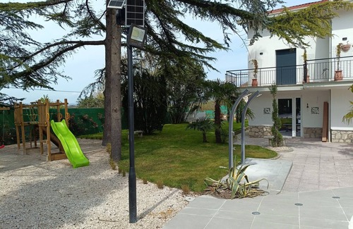 Casa delle Foglie in Calore offers shared amenities including an outdoor pool, children's pool, covered terrace, garden, playground, and gym equipment. An outdoor shower is available for your convenience.