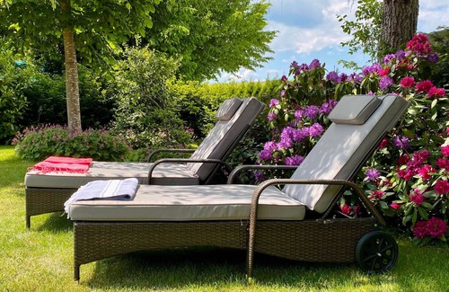 The studio apartment with balcony in our 4-star holiday home is located on the 2nd floor and offers 40 sqm of space for 1 to 2 guests. You will find a spacious living and sleeping area with a large double bed as well as a bathroom with shower and toilet. The open-plan living and sleeping area offers both a seating and dining area. The kitchenette is equipped with a sink, hob, fridge, coffee machine, kettle and extractor hood. Amenities include Wi-Fi, satellite TV, a southeast-facing balcony, central heating, and a private parking space on the property. The apartment is bright and friendly, and the use of natural building materials ensures a pleasant indoor climate. You may use the lawn with terrace. Please note: The apartment is accessible via a spiral staircase from the 1st to the 2nd floor.