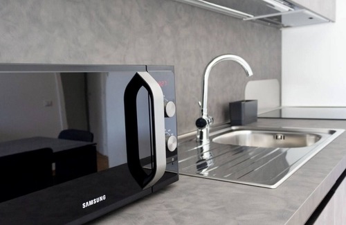 All'entrata troverete un accogliente soggiorno con TV ed un comodo divano letto, perfetto per rilassarsi dopo una giornata in città. La cucina integrata è dotata di lavastoviglie, frigo/freezer, fornelli a induzione, forno elettrico e microonde. Da questo spazio potete accedere al delizioso ed ampio balcone, dotato di una lavatrice, e con affaccio sul maestoso Castello di Giulio II.