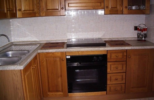First floor apartment. 3 bedrooms. Bedrooms 1 & 2 have double beds, wardrobes and dressing tables. Bedroom 3 is quite small and as such has only bunk beds and a single drawer unit. 1 large bathroom with separate shower and bathtub. Well equipped kitchen with gas hob, electric oven and fridge/freezer. Spacious living room with armchairs, dining table and chairs, satellite TV and fireplace. Private veranda. Laundry room with washing machine.