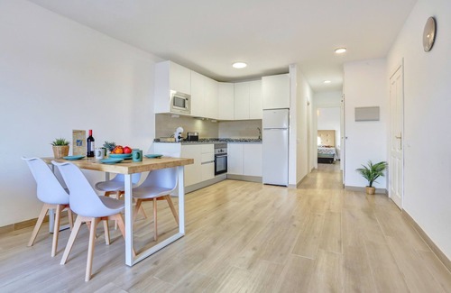 The one-bedroom space includes a well-equipped kitchenette, a living area with a sofa bed and Smart TV, high-speed Fiber Internet, and a furnished terrace for enjoying the eternal Canarian spring.