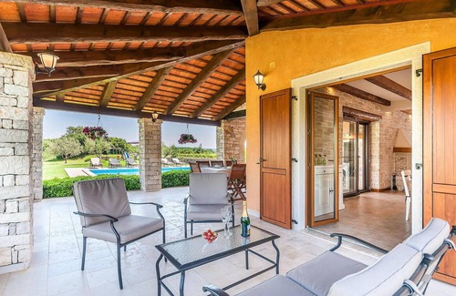 Beautiful holiday home surrounded by greenery. At the end of the small village of Filipana in southern Istria, a peninsula on the Mediterranean. The holiday home offers a luxurious accommodation experience with plenty of privacy. The natural building materials and the lighting system of the house have been carefully designed to provide maximum comfort and a pleasant holiday experience at all times. The kitchen, a WC, a twin bedroom with bathroom, a double bedroom with directly accessible bathroom, the dining area and the living room are located on the ground floor with a beautiful view of the swimming pool. On the first floor there are two double bedrooms and two bathrooms. The property is set in extensive grounds with numerous olive trees, meadows and woodland, providing a unique atmosphere and complete privacy for guests on a plot of over 22,900 m2. The area around the pool is furnished with loungers made from natural materials. Ideal for family activities, romantic getaways and relaxation, this beautiful holiday home is located in the small village of Filipana in the south of the Istrian peninsula. A holiday stay in this holiday home offers the perfect balance between peace and private enjoyment, away from the hustle and bustle of the city and crowds of tourists, but not far from all the important places on the peninsula.