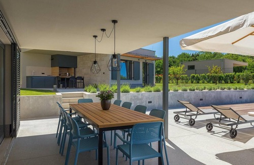 This beautifully decorated modern villa is an ideal choice if you are planning a peaceful family holiday and the fact that this modern interpretation of a traditional Istrian house is named after the famous Istrian cake adds to the warm atmosphere. Visit Villa Povetica and immerse yourself in modern design surrounded by Istrian nature. In front of the villa you have the opportunity to relax by the beautiful pool. You can enjoy your morning coffee on the elegant garden furniture in the shade of the covered terrace, where there is also a spacious dining table. The interior is characterised by clean lines and harmonious colour combinations. On the ground floor, you can enjoy the interior of the living room, from which you enter the dining room and kitchen. Soft tones extend throughout the room, beautifully uniting the interior into a single unit. We can describe the space as flooded with light, as the whole room has large windows that perfectly connect the interior and exterior spaces. On the ground floor there is also a bedroom with its own bathroom and a toilet. A spacious staircase leads you to the first floor, where there are 4 bedrooms with en-suite bathrooms. All bedrooms and bathrooms will delight you with their modern design combining natural materials, simplicity and elegance. Next to the villa is a garden pavilion, where you will find a bedroom with its own bathroom and a toilet. The covered terrace in front of the garden pavilion, where you can enjoy the barbecue and an outdoor kitchen with a dining table, is just as modern. If you are planning a holiday with your children, you will especially enjoy the children's playground on the property, and for all adventurous cyclists, "bike rental on request" is available.This villa is located in Laksici, near the small town of Vizinada, in a complex of four houses at the end of the village, on the way to the breathtaking olive groves and vineyards. Istrian nature is the ideal choice for a peaceful holiday. However, if you want to explore the Istrian culture, you will find many sights and cultural events in the town of Vizinada. For all cycling enthusiasts, the area around Vizinada is full of hiking trails where you can explore the beautiful landscape. The villa is located near the Parenzana cycle path on the old Trieste-Buje-Motovun-Vizinada-Porec railway line. The towns of Porec and Novigrad, about 20 minutes from the town of Vizinada, are certainly an integral part of Istrian culture. Porec, a town that has found its place on the UNESCO World Heritage List, offers a wide range of sights and festivals, while the town of Novigrad delights with its Romanesque churches. An indispensable part of Istrian culture is also tasting local specialities such as olive oil, Istrian prosciutto (prut) or truffles, as well as visiting nearby hilltop towns - Motovun and Groznjan. Only 20 kilometres from the villa there are two new Istrian water parks - Acquacolors near Porec and Istralandia near Novigrad.