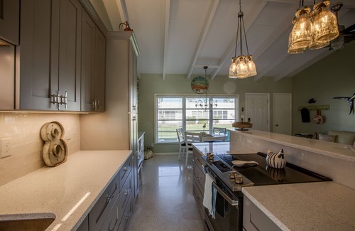 Now, let's talk about your beach home away from home. Beachaven #8 was renovated in the Fall of 2019 to include a new kitchen cabinets, new quartz counters, new appliances, new furniture, new fixtures, new lighting, and the list goes on. The design aesthetic combines a fun and fashionable coastal elegance with a bit of farmhouse style. The unit features two flatscreen TV's, Wi-Fi, and a covered carport, which is attached to the unit.