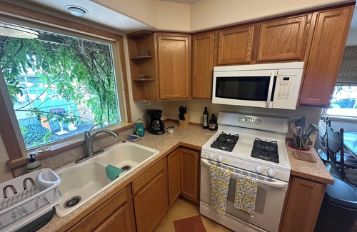 Experience Redmond like a local in this 3-bedroom house, a short walk from downtown amenities. Despite close proximity to the action, mature landscaping helps create the soothing atmosphere of this tranquil retreat. The bedrooms feature a king, queen, and full bed, plus a full sized futon. A fully stocked kitchen and ample counter space make cooking a breeze. There's a washer and dryer on premises as well.