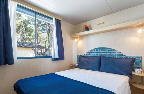 The mobile home is part of the "Baia Blu" property and offers practical furnishings. The accommodation has one bathroom with a shower and toilet.