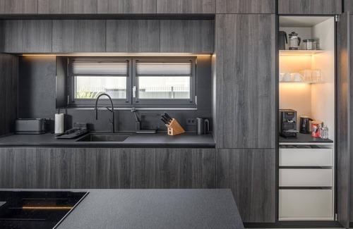 Welcome to this stylish and modern vacation home, which welcomes you with spacious accommodation and excellent facilities in a quiet location. Upon entering the beautiful house, you will immediately notice the interplay between the comfortable, dark furniture and the light colors of the walls. The feeling of elegance spreads and lets you relax. Enjoy the two fully equipped floors, including a great fitness room, where you can pursue your daily sports program.