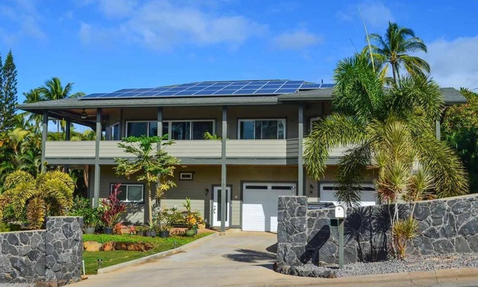 This newly built home includes a master bedroom on the upper level with ensuite bathroom with custom stone, multi head shower and separate oversized jacuzzi tub as well as a king size bed and large flat screen TV with custom a sound system. The sliding glass door with an ocean view gives direct access to the upstairs lanai. The second master bedroom on the lower level is a studio suite with ensuite bathroom and kitchenette with microwave and refrigerator. It includes two queen beds; a living area including flat screen TV with sofa and coffee table and has a with a private split A/C. Perfect for a family with small children. The large lanai with BBQ, yard, and saltwater pool are accessed through two large sliding glass doors. The home comes with an upscale kitchen with large functional center island and bar. There is a separate laundry room complete with washer/dryer and full-size sink and a convenient out-door shower. The house accommodates up to 10 guests. Maximum guest up to 12 with a fully furnished pool house with kitchenette, half bath, new private outdoor shower and new high-end queen-size sleeper sofa and dining area to host with no extra cost for reservations up to 12 guests.