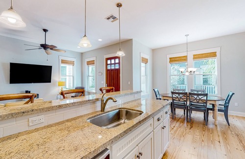 An exceptional stay awaits at this tranquil vacation home. After a fun day out and about, return to the comfort of this home where you can gather for a movie in the beautifully outfitted living room, prepare meals in the well-appointed kitchen, and enjoy evening cocktails on the porch.