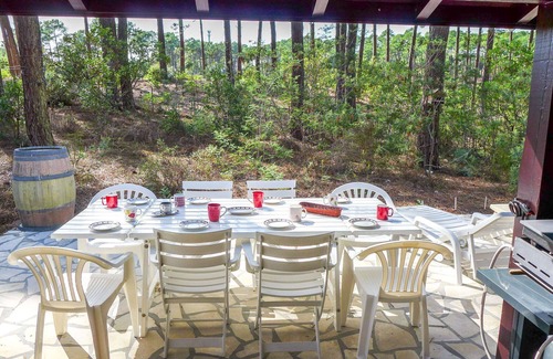 Maubuisson: Les Sylvaines is a single-family vacation rental situated on the outskirts of the town, approximately 3 km from the center. This property offers a quiet and peaceful residential location, just 4 km from the sea, 3 km from the lake, and 3 km from the beach. It features a private, fenced natural estate spanning 950 square meters, complete with amenities like Internet Wifi, Parking, and a table tennis setup.