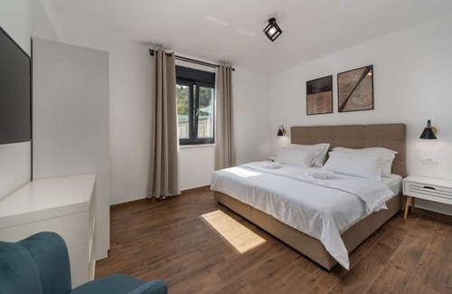 On the first floor of Villa Askim Prestige are three bedrooms (double beds) with en suite bathrooms with shower, two of which have a balcony with a beautiful view of the blue Adriatic. The ground floor has a separate toilet, bedroom with en suite bathroom, modern functional kitchen with dining room with 8 seats and a bar with 3 seats, and a comfortable living room. All rooms in the villa are air-conditioned.