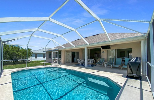 Enjoy relaxing and sunbathing on one of 4 lounge chairs next to your 28 x 14 foot sparkling private heated pool while you enjoy the beauty of Rotonda's waterways. Also located on the lanai are a BBQ grill and a dining set with seating for 6, there is 65” smart HD TV . A great area to enjoy peace and privacy after spending the day at the beach, boating, or a nearby golf course.