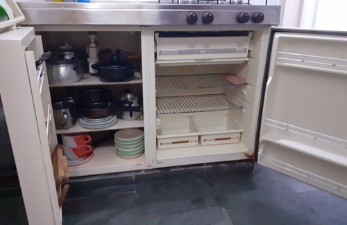 4 burner stove, manual, large minibar, sink, cupboard with pots, crockery, basic kitchen utensils. (Plates, glasses, cutlery, kitchen towels, sink cloth)