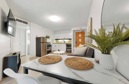 Enjoy our newly renovated Mountain View Suite complete with views of the mountain range and downtown Honolulu. This suite is 465 sq ft and features a complete kitchen and separate living area. Sleeps up to 3 guests on 1 Queen bed and 1 Full-sized sofa bed. Conveniences include high-speed wifi access, air-conditioning, a 55" flat-screen TV, a desk, complimentary bathroom toiletries, an iron & ironing board, a hair dryer, cleaning supplies, and beach towels. The kitchen is supplied with everything you need for a longer stay including a stove, toaster oven, full-sized refrigerator, microwave, coffee & coffee maker, hot kettle, and basic cookware, tableware, and seasoning. A coin-operated laundromat and swimming pool with jacuzzi are available downstairs. Parking is available at an additional fee. Housekeeping is done at check-out, but can be requested during your stay at an additional fee. Please note that a daily amenity fee applies which covers basic amenities like wifi, kitchen supplies, bathroom toiletries, and beach/pool towels.