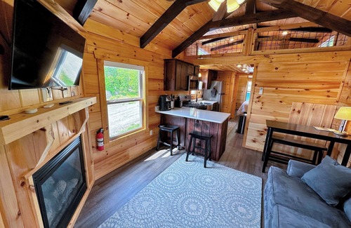 This tiny home is fully equipped for a comfortable and modern mountain getaway, ideal for couples, small families, or solo travelers looking for a cozy retreat. The main living space features a comfortable couch with a pull-out bed, a TV, and a gas fireplace, with barstool seating adjacent to the kitchen. The main bedroom (separate and private) offers a queen bed and built-in storage. A low-height sleeping loft above the kitchen is accessed by a set of steps and includes two twin beds, perfect for kids or extra guests. The kitchen includes a dishwasher, microwave, oven, refrigerator, and even a stackable washer/dryer for added convenience. The bathroom is sleek and functional, featuring a shower, and towels and linens are provided.