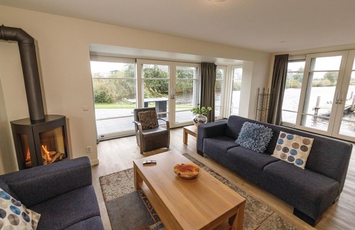 There is a large house under the stylish thatched roof. From the living room and the sun-facing terrace you have a wonderful view over the countryside. On one side of the house you have access to a sheltered spot for your boat. The 3 bedrooms and bathroom (with shower or bath) are on the ground floor. There is a separate WC on the ground floor. The house has its own jetty with a bathing ladder. You can swim directly from the house. There are several apartments of this type in the park. The exact location in the park may therefore differ from the pictures. The interior may differ from the photos, all houses are treated with the same quality standards. The house is equipped with all amenities, including Wi-Fi, flat screen TV, central and underfloor heating, dishwasher, microwave. In addition, you can park two cars at the house.