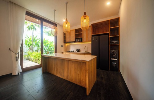 Villa Laksmi is a brand-new two-story, three-bedroom villa located in the central city of Sanur. It features a spacious living room, dining area, and a fully equipped kitchen, plus three bedrooms, each with an en suite bathroom. This beautiful property features natural wood finishes and abundant natural light, plus a swimming pool surrounded by gardens, a comfortable seating area, and an outdoor terrace.
