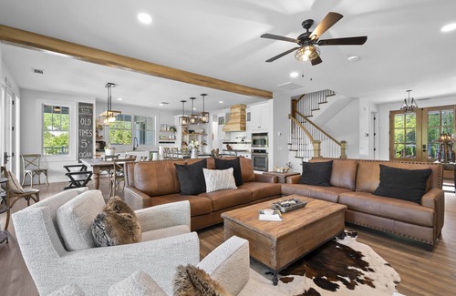 "Rumbling Pointe at Lake Lure" is a brand new gated six (6) bedroom, seven (7) bathroom (plus outdoor shower) home built in the tradition of the classic 1940's lake house homes of yesterday. With 5000+- sq.ft. of air-conditioned living space and 5000+- sq.ft. of covered porch space, the home's 10,000+- square feet of living space provides significant indoor and covered outdoor space to spread out and enjoy the lake made famous by the movie "Dirty Dancing". The on-porch 50 inch Roku TV allows guests to watch sports while enjoying the outdoors under the covered 12 foot wide porch. The middle on-porch bed swing provides countless hours of reading and relaxation opportunities. With three (3) covered porch's to choose from guests have ample opportunities to enjoy the views of Rumbling Bald and Lake Lure. Prior to arrival you will receive a guest preference questionnaire which will help us further refine your stay's possibilities at Rumbling Pointe at Lake Lure. Rumbling Pointe at Lake Lure has four King Bed (4) en-suite bedrooms, two (2) bunkrooms and an elevator (extra charge) connecting all floors. Rumbling Pointe has a natural sandy beach for easy lake access and a dock and boat house.
