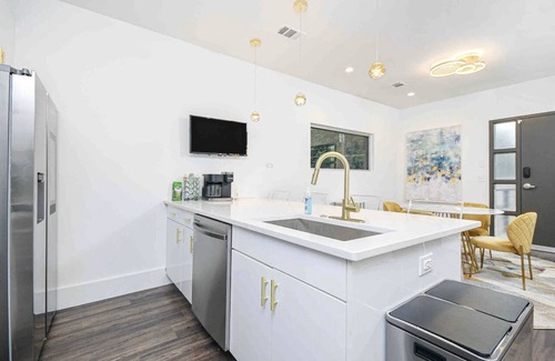 As you enter, enjoy the beautiful open concept, sun drenched dining and kitchen area. The kitchen is adorned with quartz countertops, golden accents, stainless steel appliances, and complimentary mini cafe. The living room consists of a 75” Television with a sound bar and subwoofer perfect for a movie night. The stairs lead down to a dual car garage that you can access from the inside equipped with remote. The third level up has two beds, one with a King bed and the other with two twin sized beds for extra company. The best part, each room has its own private full bathroom.