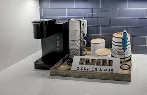 Just off the living room is the open kitchen, featuring quartz counter tops, stainless steel appliances, coffee bar fully stocked with all the essentials. Enjoy meals at the dining table for 8, with room for 4 more at the over-sized kitchen island.