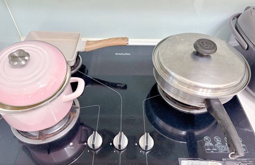 Fully equipped kitchen with cookware, utensils, and dinnerware