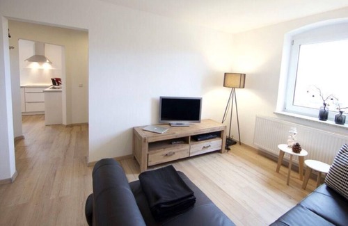 The bright and friendly flat has a living/dining room area with a pull-out sofa bed for a maximum of two children, a flat-screen TV with satellite TV and a wooden table with seating for four people. Directly adjacent to this is the open and modern fitted kitchen with induction hob, fridge with freezer compartment, dishwasher, toaster and coffee machine, which leaves nothing to be desired. The separate bedroom has a double bed (1.60 m wide). The modern bathroom is equipped with a floor-to-ceiling glass shower and a rain shower, as well as a toilet, a washbasin and a hairdryer. Heating is available throughout the flat. Free internet access (high-speed DSL) is available in all rooms of the flat.