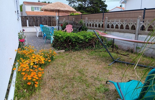 Located on Boulevard du Lay, 600 meters from the beach and 500 meters from the shops, ideal for not using your car during your vacation. It includes: A veranda, a living room with TV and Wi-Fi, a kitchen equipped with two induction hobs and two gas hobs, an oven, a refrigerator with a freezer compartment, a microwave, and a dishwasher. Two toilets. A bedroom with a 150 cm bed and two 90 cm bunk beds. A bathroom with a shower and sink, and another bathroom with a bathtub, sink, and washing machine. A 2nd bedroom with a 160 cm x 200 cm bed - Garden with a 40 m² wooden terrace, garden furniture, hammock and barbecue - Housekeeping at the tenant's expense. Linen not provided, rental possible from our partner, contact us. Heating from October 1st to May 31st extra according to meter reading.