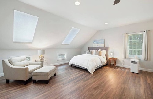 The Carriage House at Piper’s Cove sits up the (tiny) hill from the Main Waterfront Cottage. Newer construction, this 1400 sqft one queen sized bedroom apartment was added above the craftsman style garage, complete with a full straight-line kitchen, one full bath, its own W/D, queen pull-out sofa and additional twin trundle beds. There are doors to close off the living area with the sofa and trundle bed for privacy.