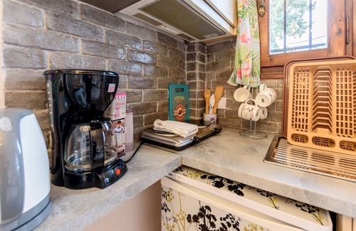 The kitchen has a fridge, a hob, an coffee maker, a kettle, a freezer.