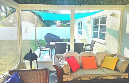 Discover this 3-bedroom gem in Clearwater, right across the creek, where you can spot manetees all year. This beautiful house features 1 king bed, 1 queen bed, and 2 double beds, 1 twin bed, 1 airbed, perfect for a family or group of friends. With 2 bathrooms equipped with a bathtub and shower, guests can relax and unwind after a day of exploring, sunning, fishing, or scuba diving. The serene atmosphere of the property, along with amenities like AC and heating, BBQ and gourmet kitchen, ensures a tranquil and joyful family oriented stay. Fall in love with Clearwater and enjoy the magic it has to offer. Come for TD park to watch the BleuJays in season, bike on the 100k trail, sun in Honeymoon Island or visit the Pier 60 and our world famous Clearwater beaches. Move around town via the jolly Trolley or by bikes to avoid parking issues.