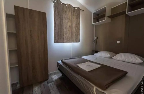 Details: Beach Access : 10 m Wi-Fi access : Wifi access in mobile homes €8/day or €23/week - free within the bar and swimming pool Playground for children : Yes Children's animation : children's club with entertainers - from 5 years old Family animations : theme evenings, shows, sports tournaments Grocery store : small grocery store available on the campsite Laundromat : prices and regulations on site Towels : 10€/kit Sheets rental : 16€/single bed - 19€/double bed Final cleaning : 100€ Number of stars : 4 Car park : free, 1 space per rental bowling Ping Pong : ping-pong tables available Swimming pool : heated infinity pool - water play area Restaurant : restaurant with bar Tourist tax (surcharge) : tourist tax and eco-tax 1.16€/pers/day Multisports ground : beach volleyball, football... Surface (m²) : 31 Number of bedrooms : 3 Cooked Number of bathroom : 1 Number of toilets : 1 Terrace Barbecue Air conditioner