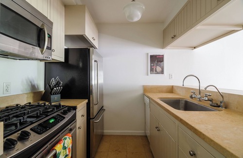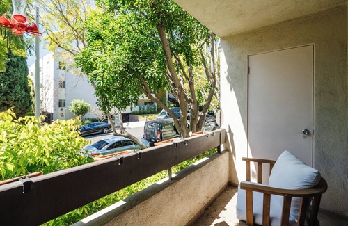 Enjoy a cozy and clean experience at this West Hollywood located studio condo! The design is Palm Springs inspired with plenty of fun and quirky artistic details. The complex is like staying at a resort with beautiful landscaping and many great amenities. This is 455 sq ft of cuteness! It's designed for longer stays - has everything you need without feeling cluttered.