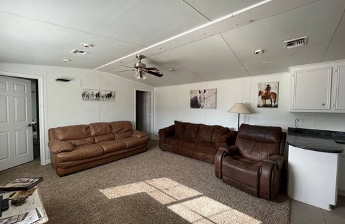 This container home is located just outside the bright lights of the city of Alpine, 5 mins from town. Enjoy gorgeous uninterrupted views of the mountains and the night sky with stars galore! Nestled on a working cattle ranch, not uncommon to see wildlife and cattle around the house. 2 private bedrooms, each has its own bathroom and vanity. Full kitchen and living room. 3rd room with full office and working area for multiple people. Spacious front porch with open to the sky views.
