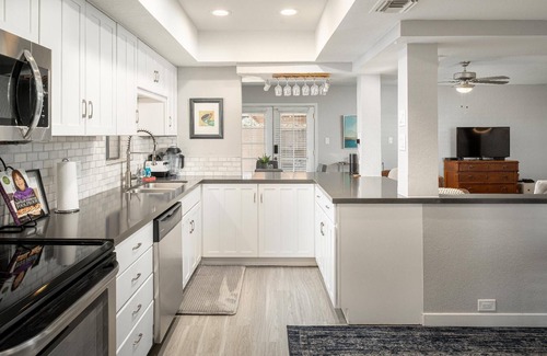 Discover your tropical oasis in the desert, situated within walking distance of Scottsdale Fashion Square and Old Town's vibrant scene. Enclosed in a gated community, guests have access to the pool and tennis facilities. The home’s heart is an open-plan living space bathed in natural light from soaring clerestory windows and adorned with beautiful local art and comfy seating. Step out to a patio, where a BBQ grille stands ready for al fresco dining amidst the tranquil greenery.