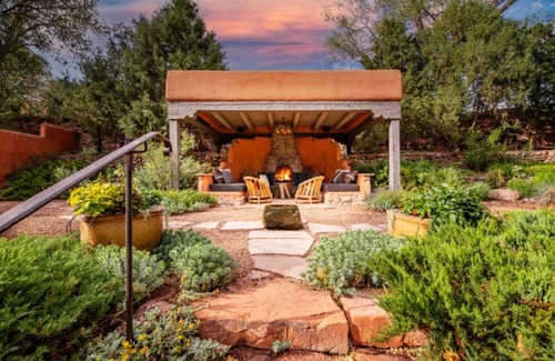 This magnificent three bedroom, three and a half bath home is located on the esteemed Palace Avenue in the heart of the historic district of Santa Fe. Situated on a full acre, the home features a large front lawn, side orchard, and a backyard with two patios and covered portal with a kiva fireplace, all within walking distance to the Plaza. The interior is elegantly furnished with a private collection of antiques and art work by the owners who are a family of interior designers and photographers. The granite countered luxury kitchen is fully equipped with modern cooking equipement and accessories and is fully stocked with serving wear for entertaining. There is a luxurious steam shower, four fireplaces, plasma TVs as well as the absolute highest-end amenities. This home is full of details unlike any other in Santa Fe and comfortably sleeps eight people.