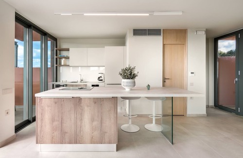 On the first level, the living room with a comfortable 3 meters sofa, invites you to unwind and soak in the breathtaking views of the swimming pool and the glistening sea beyond. Large windows and glass doors allow natural light to flood the space, creating an airy and inviting atmosphere. At the same level, the kitchen is fully equipped with a Bosh® fitted oven, Whirlpool® fridge, and Bosh® dish washer, while the kitchen island with the Bora® ceramic hobs is where delicious dishes are made, and life happens around. Adjacent to the kitchen is a convenient WC.