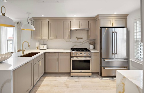 As you make your way up the 1st flight of stairs, you are welcomed into a dream kitchen away from home! The modern, fully equipped space blends elegance with function. Whether you're brewing your morning coffee or preparing a gourmet meal, you'll love the spacious quartz countertops, stainless steel appliances, and gas stove. Gather around the island, perfect for sharing a meal or conversation. A sliding barn door adds a chic touch while leading the beautifully designed half bathroom. . This kitchen is not just a place to cook—it's a place to connect, relax, and feel inspired