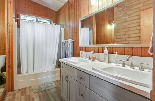 The cabin is under new ownership and has been spruced up for your comfort! King and queen beds are located on the bottom floor, while upstairs you'll find a large bunk room with two twins over full bunk beds, comfortable for 10 guests total if 4-6 are children. Parents are advised to use caution with small children on the stairs and top bunks. Both bathrooms have been recently updated. The kitchen has been remodeled for easy access around the fireplace and maximum space for your guests. The kitchen can be tight- it's best for 2-3 chefs at a time. The showstoppers, and our favorite part of the cabin, are beautiful floor-to-ceiling windows, literally a "glass wall" to take advantage of the gorgeous wooded views during the summer, and magical snowfall during the winter. Outside there's a wrap-around deck where you'll love to lounge and breathe in the fresh mountain air. Air conditioning is provided in most of the rooms, a rarity in Shaver and a necessity during the hot summer days!