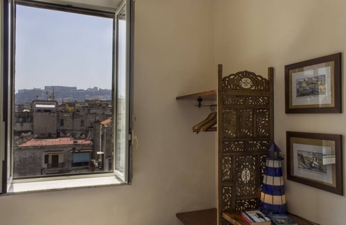 On the top floor of an old building located in the old centre of Naples, the view looks over rooftops and domes and looks east to Vesuvius and to the west to Castel Sant\'Elmo and the Certosa di San Martino, which sit on a hill.