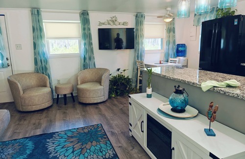 Consider this lovely cottage your home away from home while you visit Bay St. Louis. The Cottage At The Campground offers what we like to call the country salt life. Located just ten minutes to beaches, casinos, restaurants and shopping, but away from the town. The cottage sits at the front of our campground and amenities include all the campground has to offer. This fabulous property features 1 spacious bedroom with a queen sleep number adjustable bed, a charming open floor plan kitchen and living room with a futon, and a modern bathroom with a shower and hair dryer. Enjoy amenities like a heated pool, fitness room, WiFi, washing machine, AC, iron, and more. We're happy to assist with any questions while you stay at our cottage.
