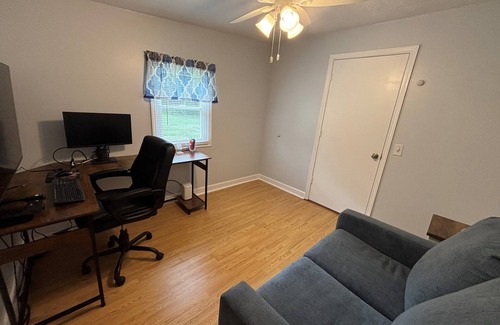 This West Paducah house boasts two inviting bedrooms with a king bed in the master and a queen bed in the second bedroom. In addition, there is an office space with a cozy sofa bed for extra comfort. The bathroom comes equipped with a hair dryer, oversized shower / bathtub and towels for your convenience. The dining room hosts a table for 6. The kitchen is fully stocked with dishes and silverware for 12, a coffee pot, Keurig machine, coffee pods, pots and pans, baking dishes, crock pot, blender, mixer and anything else you can think of to make yourself feel at home. Enjoy our outdoor space on the patio, in the spacious yard or relax with a fire at the firepit (firewood available to enjoy). Have a BBQ on the patio with our gas grill. If you are looking for a game night, feel free to enjoy a game of cornhole in the yard or board games and cards inside.