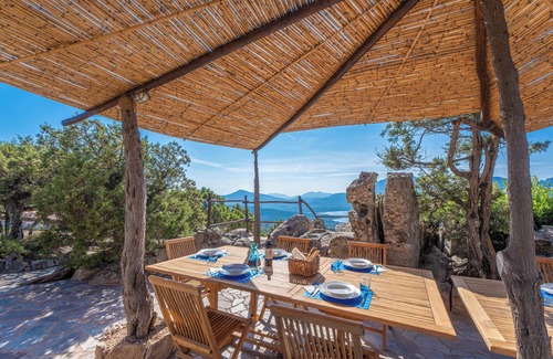 The PANORAMIC TERRACE, besides being the Beating Heart of the Villa, was built with impressive Millennia-old Sardinian Granite Stones. It is furnished with Sofas and Cushions, a Stone Table with "director’s" chairs, and Hand-carved Benches imported from Thailand. This area is the ideal spot in the house to admire Spectacular Sunsets that fade over the Sea horizon.