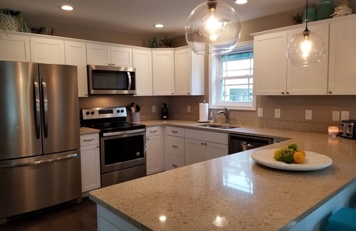 Rest A' Shored is a brand new home (2019) with a sweeping, open floor plan that can comfortably accommodate two families with children or three couples for your island retreat. Located on Willow Street, the property is just a short walk to Main Street and the Chincoteague Fair Grounds, right in the heart of the pony penning action! The house provides all the modern amenities needed for your stay, with a touch of Chincoteague charm. The kitchen is well equipped with everything you need to cook for a crowd! Granite counters, 2 refrigerators, dishwasher, plenty of pots, pans, serving utensils, crockpot, electric griddle, even a blender for all those mixed drinks! Enjoy family meals at the dining room table which comfortably seats 8, plus an additional 5 at the bar top on the kitchen island. A large screened in porch can accommodate all your guests to enjoy meals outdoors, or relax with a cocktail and feel the cool evening breeze! Designed with families in mind, beach chairs, umbrellas, and toys are available for use for sunny days on the beach. For those rainy days, the large living room sectional is perfect for snuggling up to catch a movie! Highspeed internet is available, with multiple TVs, and Microsoft X box in the kids room to play any video games you bring with you (need to bring your own controllers and games). For the small ones, a pack and play is available for your use. This is a dog friendly home as we know they are part of your family! (extra pet fee applies)A large driveway provides plenty of parking for up to six passenger vehicles.