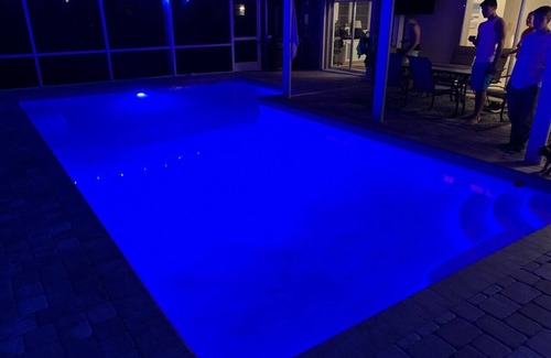 The newly renovated pool area boasts a new paver patio, screened LED lighted lanai, table and chairs, flat screen tv and small refrigerator for your convenience. The heated pool with multi function LED lights to set the perfect mood, has two sitting areas for viewing the television.