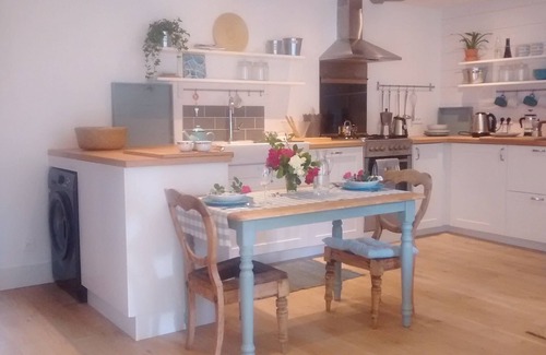 Les Galets is a charming renovated south facing cottage situated in a quiet corner of Pleslin off the main road in a group of stone houses and barns and just 4km from the Rance estuary in Plouer and in the heart of the touristic region Côte d'Emeraude. It has recently been renovated to a high standard to be a romantic charming and cosy retreat both in the summer and winter. It has preserved some of its old character features like beams tastefully incorporated with more contemporary features, restored furniture sourced from the UK adds to the charm. There is solid oak flooring throughout from the local Pleslin saw mill. The ground floor attractively combines kitchen/dining/living and includes everything you need for a comfortable stay. There is a feature fireplace with wood burner and also Electric wall heating. TV is via the French orange internet service. WiFi is free and of excellent quality. The backdoor leads out to a newly created enclosed back garden area with terrace decking, garden table and chairs, beyond the fencing is a larger grass area and orchard in common with next door holiday cottage Les Embruns.1st floor has a spacious south facing landing area with small table and chair for laptop working if necessary. There is a south facing double bedroom with 2 standard single beds, clothes storage and Electric wall heater. The WC is separate from the bathroom which has both full size bath, walk in shower, basin space with shelving storage and heated towel rail. Further stairs lead up to the 2nd floor master bedroom under the eaves and original beams. This space is a very large romantic and characterful with a king size (160cm) bed, bedside tables, chest of drawers, table, 2 chairs, dressing table with stool, clothes hanging rail and French antique child bed. (Spare futon mattress available under this bed) Also nearby is Tremereuc (9 hole) golf course and Dinard/Saint Briac 18 hole seaside golf course. Sailing clubs, stables. Voie verte cycle/hike/bridleway, this is the transformed defunct railway track from Dinard to Dinan (23km) which closed in the 80’s and can be accessed within 4/5 minutes walk of the cottage. The commune of Pleslin has a bakery, resto/pizzeria La Lanterne, minimart grocery store, pharmacy, cultural centre, town hall and post office. It is well known for its megalithic standing stones Druid burial site. Coastal sea boat excursions are available by compagnie Corsaire and I highly recommend taking the sea bus from Dinard to Saint Malo when planning to visit. Aquarium : Saint Malo. Zoo : La Bourbansais at Pleugeuneuc between St Malo and Rennes. Water park ‘AquaMalo’ at St Joan des Guérets. Restaurants and crêperies in abundance in even smaller towns especially on the coast (Pleslin has a Pizzeria La Lanterne)