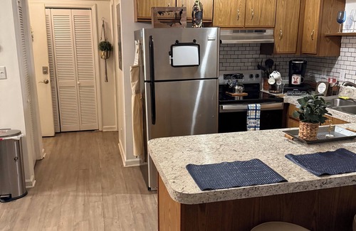 Welcome to your perfect home base! This charming 3rd-floor walk-up studio condo offers comfort, style, and convenience all in one. Ideal for solo travelers or couples, the space features a comfy Queen size Murphy bed, a queen air mattress, a well-equipped kitchenette, and plenty of natural light. Located close to local shops, dining, and attractions—everything you need is just steps away. Come relax, explore, and enjoy your stay in style!