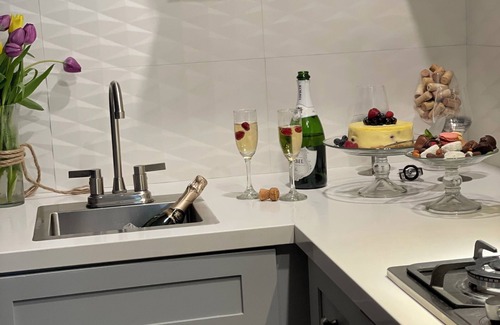 Walk or bike to all the amazing restaurants and shops that Napa has to offer. Inside you will find a queen bed, full kitchen (But why cook with all of the Michelin Star restaurants in Napa) stocked with coffee, nondairy creamer and spices. There is also a spacious bathroom with a large mosaic tiled shower. Complementary body wash, shampoo and conditioner from Luseta. The custom dining table for two provides an intimate experience when dining in.