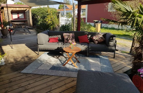 charming new wooden house built in the tradition of resin huts and oyster huts with all the modern comfort. Located a 5-minute walk from the town center and the market, you can also take the cycle path which passes in front of the gate. The house is oriented south-east, with a terrace on both sides, that to the east is equipped with a plancha.